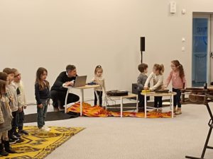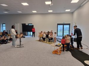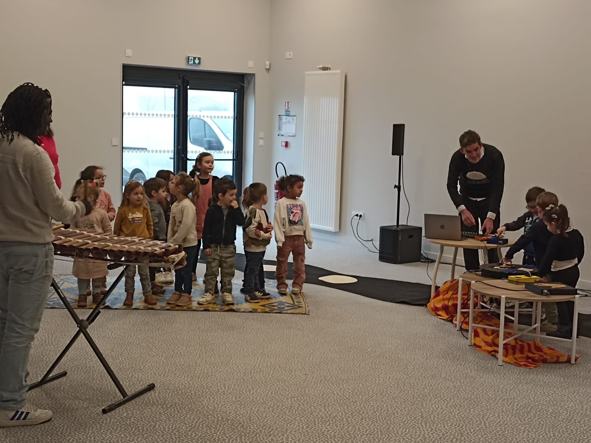 Restitution de notre projet musique au complexe sportif et culturel du Clos Olivier à Teillé. Nous avons présenté notre musique et notre chanson créées en classe plusieurs semaines auparavant devant la classe de Gildas ainsi qu’une classe de l’école de Mouzeil. Gurvan nous a aidé à mixer avec les interfaces et Amadou a joué du balafon et a chanté avec nous.