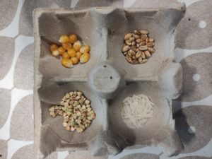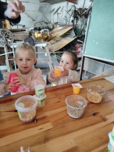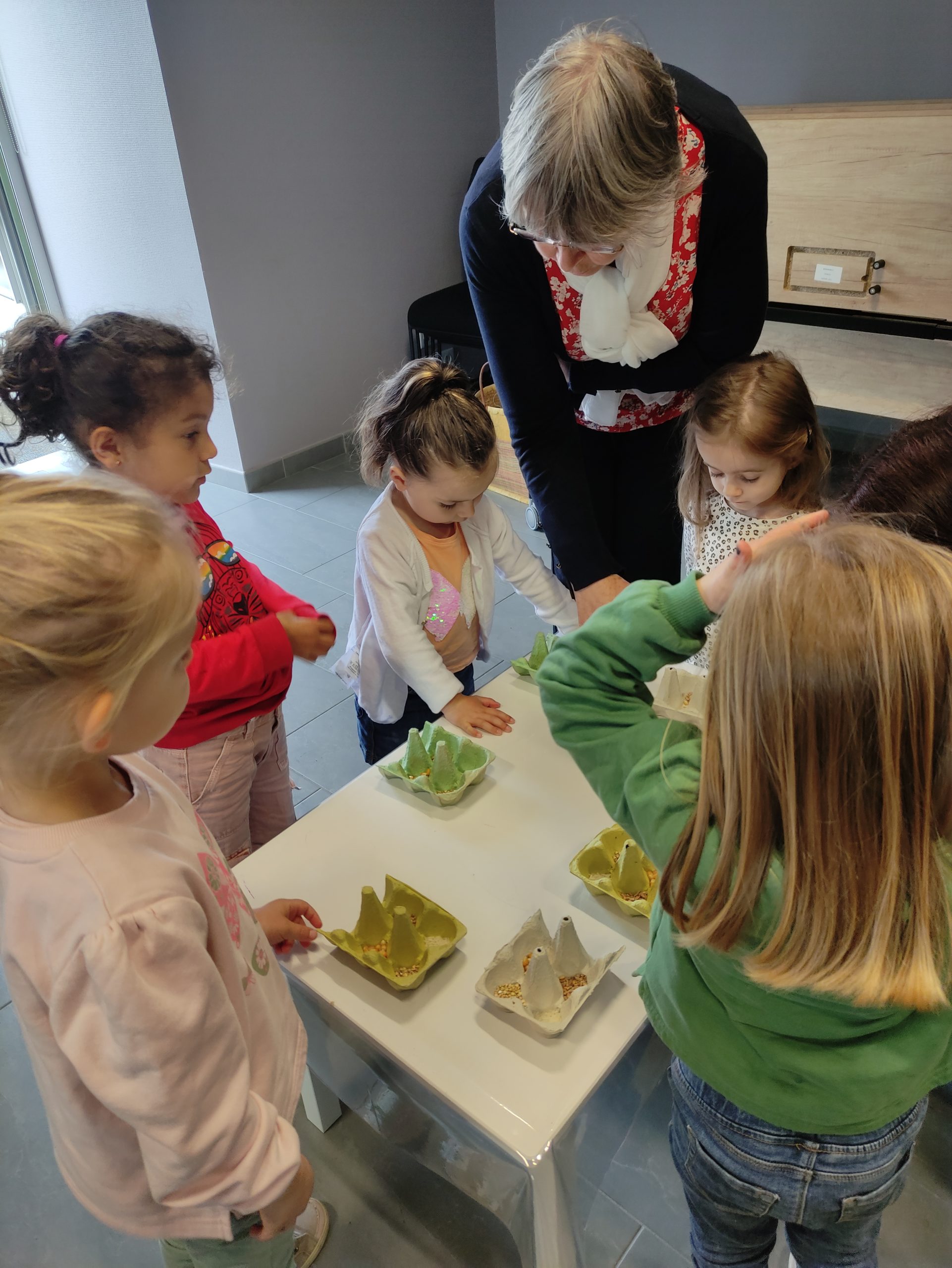 Nous avons découvert à travers nos 5 sens le maïs, le blé, le sarazin et le riz.Nous avons senti divers pots dans lesquels il fallait retrouver les odeurs .Nous avons observé les couleurs, la taille , les formes.Nous avons touché et essayé de retrouver chaque sorte de graines cachées dans des sacs opaques .Nous avons même fabriqué des maracas , les graines en s’agitant font une jolie musique .